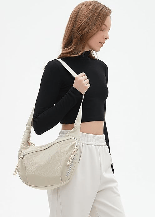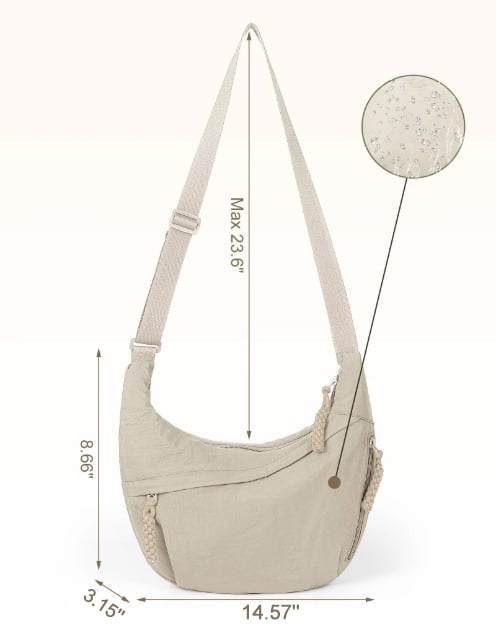 Perfect formaat voor dagelijks gebruik: Met een breedte van 37 cm, een hoogte van 22 cm en een dikte van 8 cm biedt onze halvemaanvormige nylon tas de perfecte balans tussen ruimte en elegant design voor dagelijks gebruik. Met een verstelbare schouderriem die tot 120 cm verlengd kan worden, kun je gemakkelijk wisselen tussen de klassieke schouder- en trendy crossbodystijl voor ultieme veelzijdigheid en comfort.