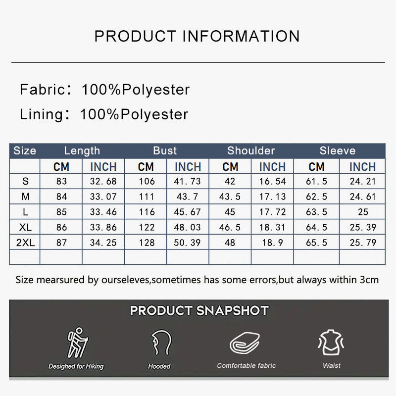 - Waterafstotende buitenlaag: De jas is gemaakt van 100% polyester en stoot lichte regen en mist af, zodat u droog en comfortabel blijft op onverwachte natte dagen. Nooit meer haasten om een paraplu te pakken bij de eerste druppels!