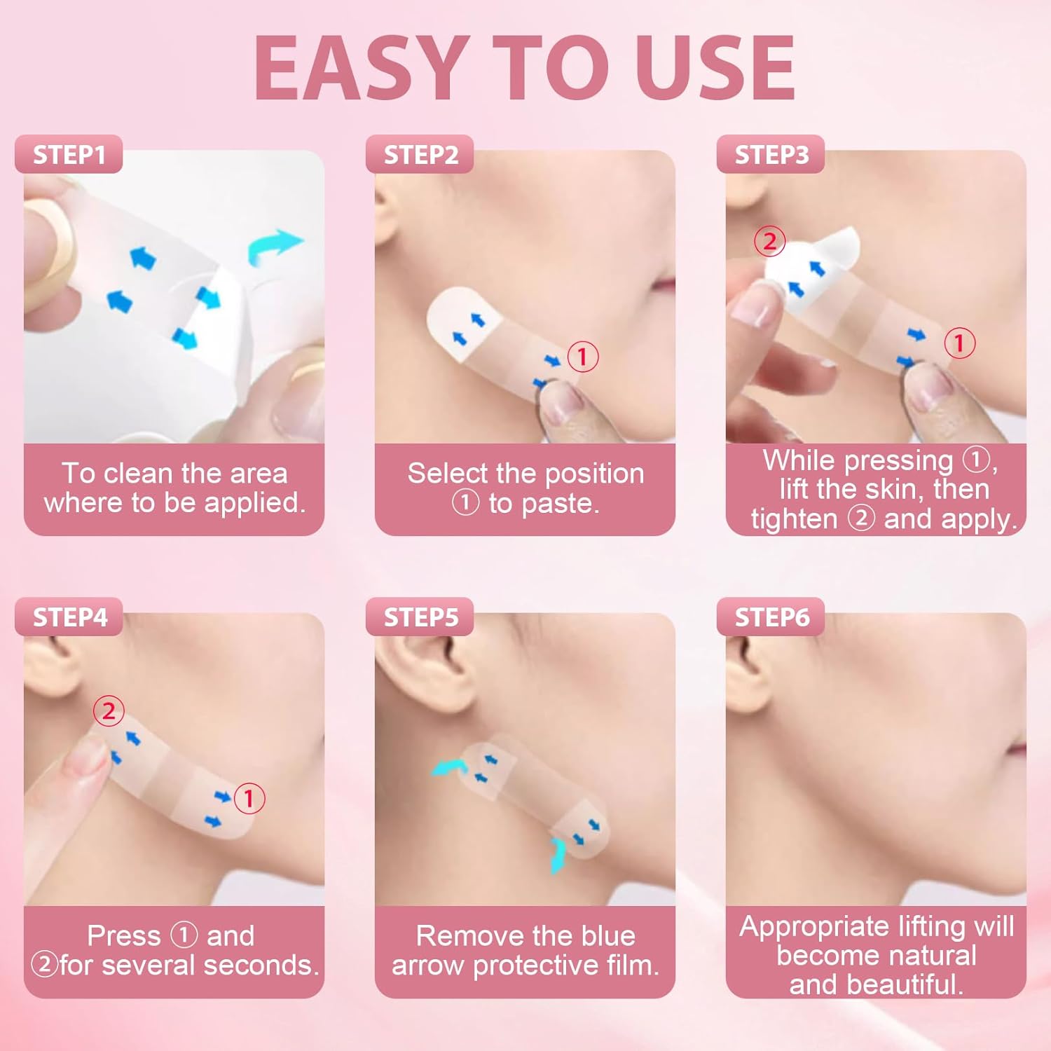 ❣️【Easytouse】Plaats gewoon een uiteinde van de facelift tape op de huid, trek de huid dan 1 - 2 centimeter naar achteren en druk stevig omhoog voor direct resultaat! Zorg ervoor dat je gezicht vrij is van make-up of olie voordat je de onzichtbare facelifttape aanbrengt. Ter herinnering: het doet een beetje pijn als je het eraf trekt, dus je kunt het opwarmen of verzachten met make-up remover voordat je het verwijdert.